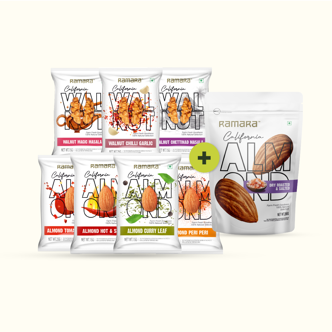 These Flavored Almonds and Walnuts are directly sourced from farms to nourish you with loads of Protein and Energy. Get ready for your Healthy Booster Snack Now! Crafted from Premium California Almonds and Walnuts sourced directly from Farmers, this vibrant and spicy snack is rich in Protein and Energy. With Unwavering Quality in each bite, it offers an ideal combination of Spice, Crunch, and Nutrition, making it a Guilt-free and Flavourful Indulgence.